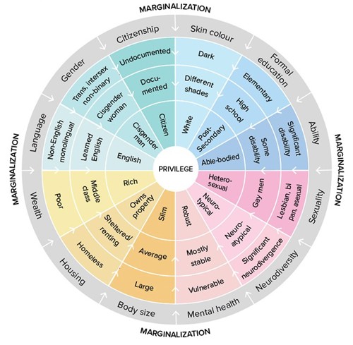 Wheel of Power, Privilege, and Marginalization, by Sylvia Duckworth. Original from the Canadian Council of Refugees (CCR): https://ccrweb.ca/en/anti-oppression